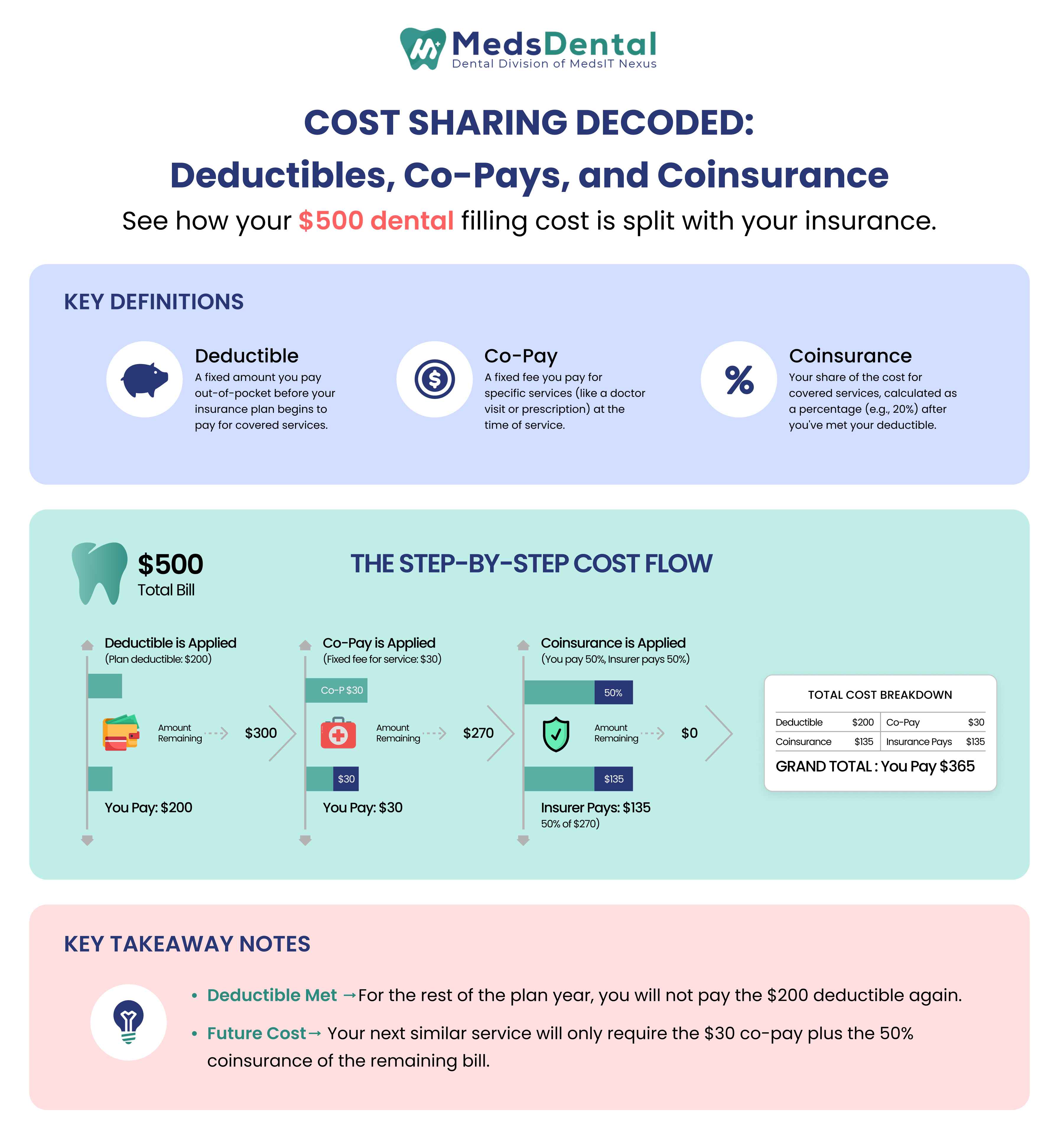 Dental care costs may seem complex initially, but the key terms come down to a straightforward relationship. Deductibles determine when your insurance begins to share costs. Co-pays establish a fixed amount for many visits. Coinsurance defines the percentage you are responsible for after meeting your deductible.